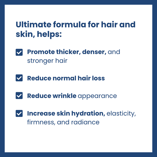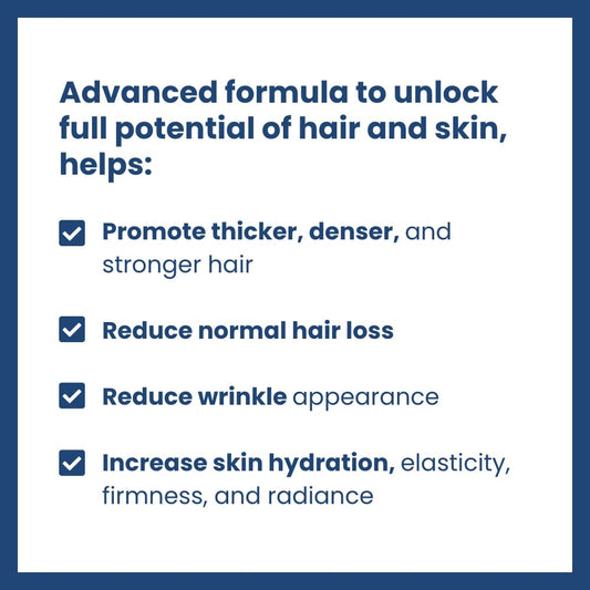 Regular price $99.97Regular priceUnit price / perSale price $99.97Advanced formula promotes thicker, denser, and stronger hair and reduces normal hair loss, hydrates skin, increases glow, and reduces wrinkle appearance.