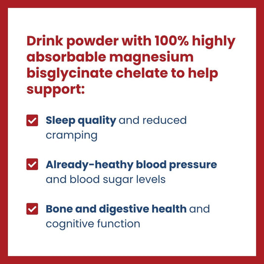 Regular price $24.97Regular priceUnit price / perSale price $24.97Drink powder with 100% highly absorbable magnesium bisglycinate chelate to support sleep quality, less cramping, and bone, brain, and heart function.