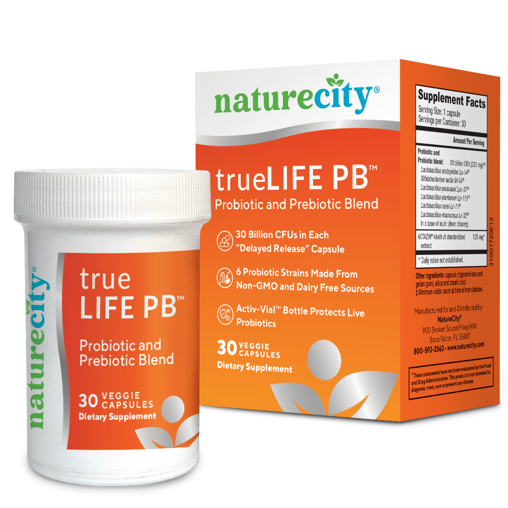 TrueLife PB blends 30 billion CFUs from 6 probiotic strains, plus 2 prebiotics. Activ-Vial™ bottles protect live probiotics and preserve potency. Delayed release DRcaps® protect probiotics from stomach acid. Non-Dairy and Vegan Friendly.
