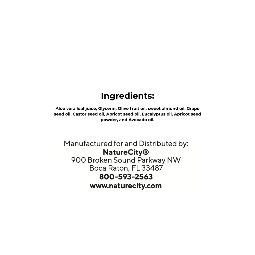 Combination of natural oils – olive, avocado, almond, grape seed, castor seed, apricot seed and eucalyptus.