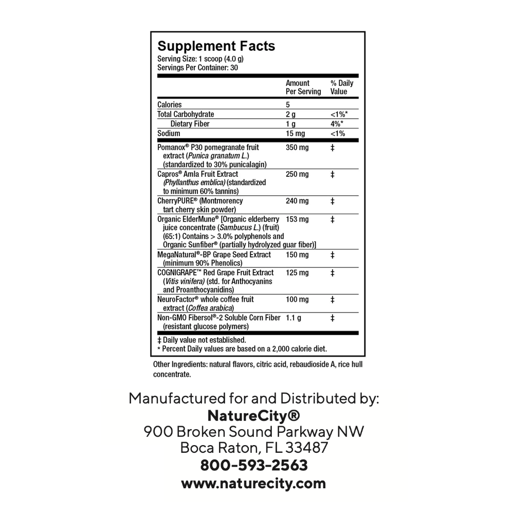 The organic elderberry powder in ElderMune® contains an exceptionally high amount of polyphenols – 65 pounds of fresh elderberry fruit is used to create 1 pound of the elderberry juice concentrate (this compares to around 10 pounds typically used in generic elderberry powders).