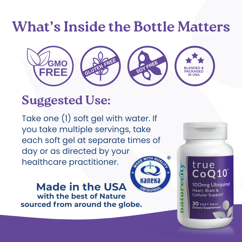 TrueCoQ10 contains the active CoQ10 as ubiquinol so no conversion is needed – your body can put it right to work. It’s made with the premier source of ubiquinol, Kaneka QH®, which is made using an all-natural yeast fermentation process. The vast majority of the ubiquinol research conducted to date has involved Kaneka-QH®.