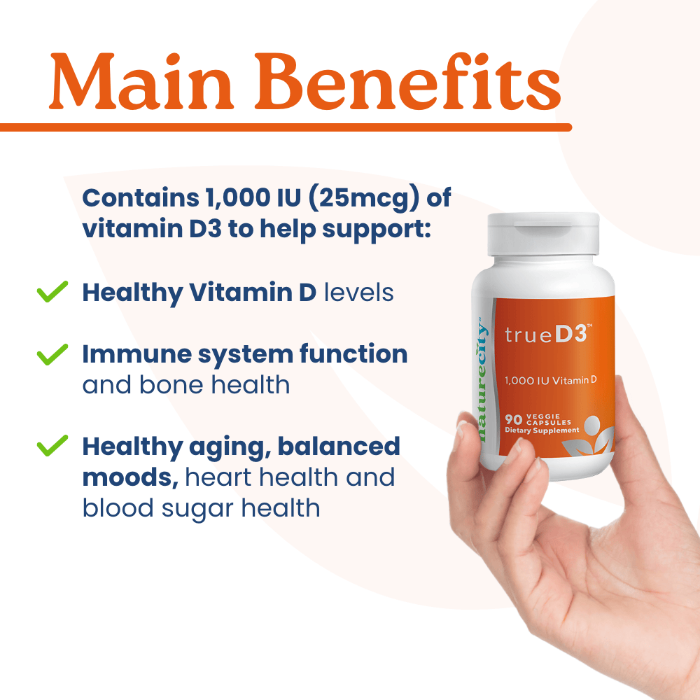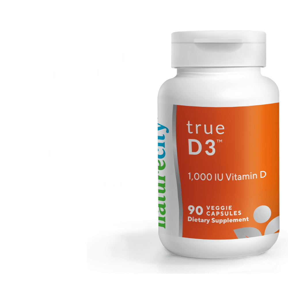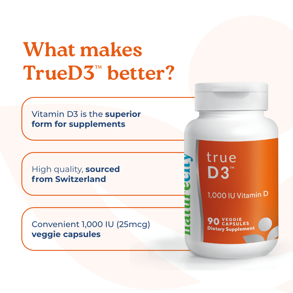 TrueD3 can be used to help optimize vitamin D levels, as it contains the most powerful form for use in supplements, which is cholecalciferol. Each capsule contains 1,000 IU (25mcg) of D3, sourced from Switzerland.