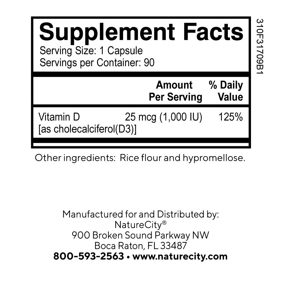 Vitamin D [as cholecalciferol(D3)] | 25 mcg (1,000 IU) | 125% |