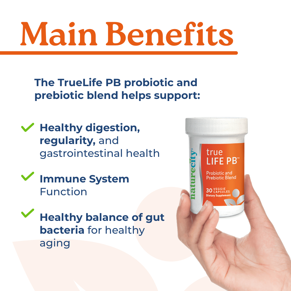 The probiotics in TrueLife PB can help support digestive and immune system function in numerous ways including helping to support regularity, reduce bloating and flatulence, ease intestinal discomfort, reduce occasional diarrhea and promote a healthy microbiome and gastrointestinal function.