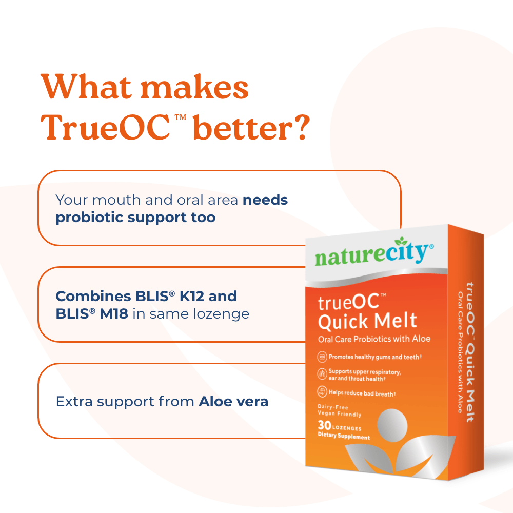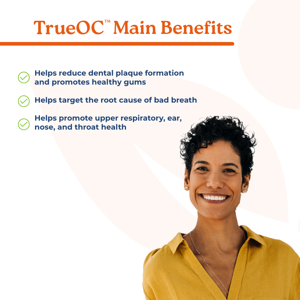 You may be aware of the value of probiotics for gut health and maintaining a healthy microbiome environment in the intestines. It’s less commonly known that there’s another microbiome where we need to protect against the overgrowth of bad bacteria, which is the mouth and surrounding upper respiratory area (ear, nose and throat). The two oral probiotics in TrueOC help support you with this goal.