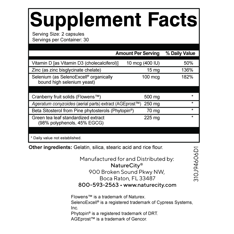 Zinc has many functions that help the prostate such as promoting prostate cell health, supporting immune system performance and a healthy inflammation response, and acting as an antioxidant.