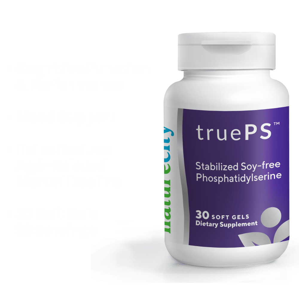 Each TruePS soft gel contains 100mg of phosphatidylserine from 556mg of the soy-free Sharp PS® Green oil. The other components of the oil include phosphatidylcholine and phosphatidylethanolamine and sunflower lecithin.