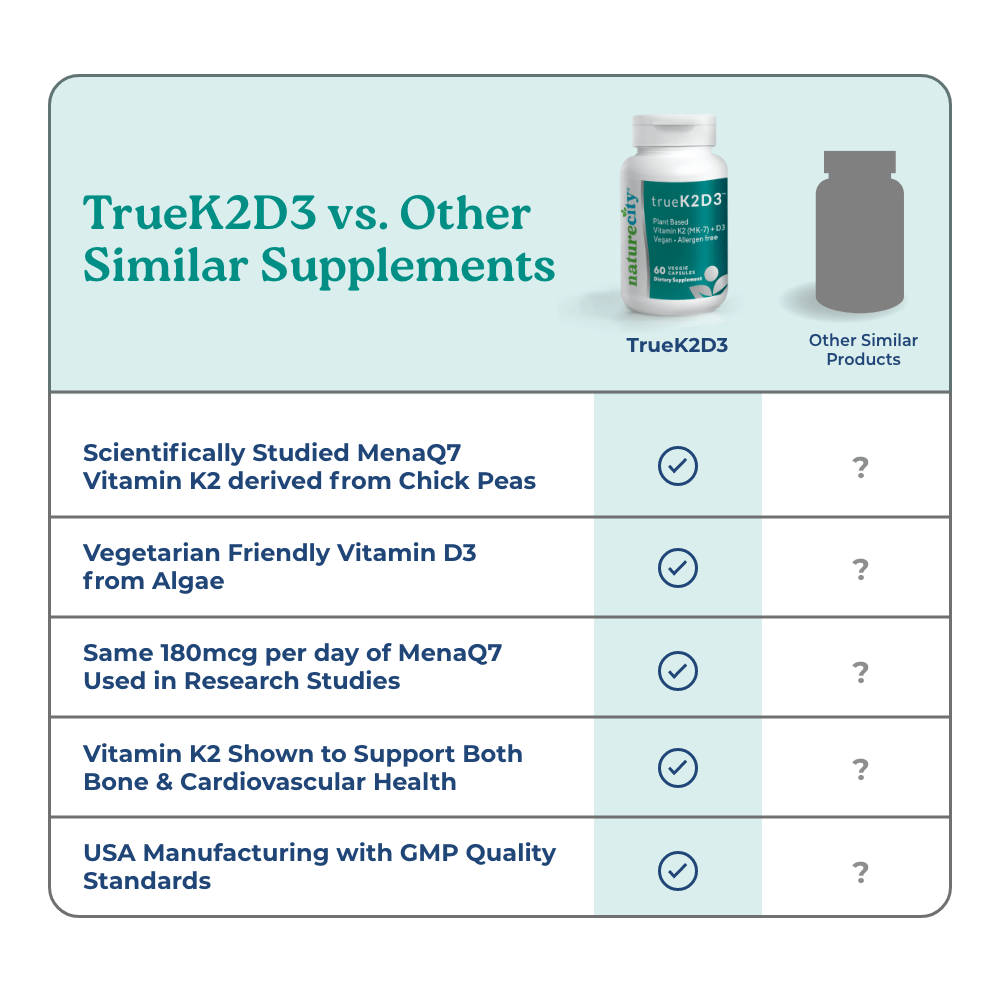 Each day, TrueK2D3 gives you the same 180mcg of MenaQ7® vitamin K2 that was found to be beneficial in these research studies.