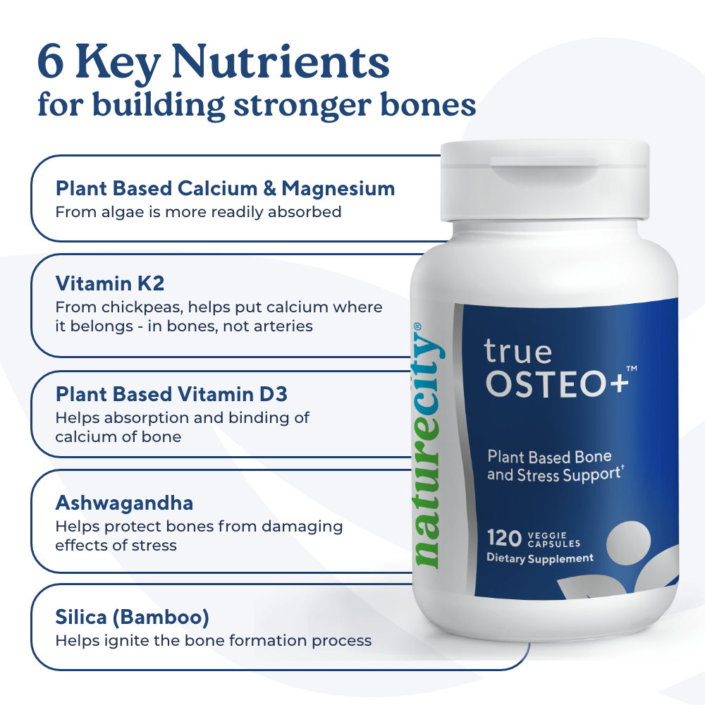 To help ignite the bone formation process, your body uses the mineral silica – which works to attract calcium to bones, resulting in harder, denser bones. TrueOsteo+ includes organic silica from bamboo shoots to energize healthy bone building.