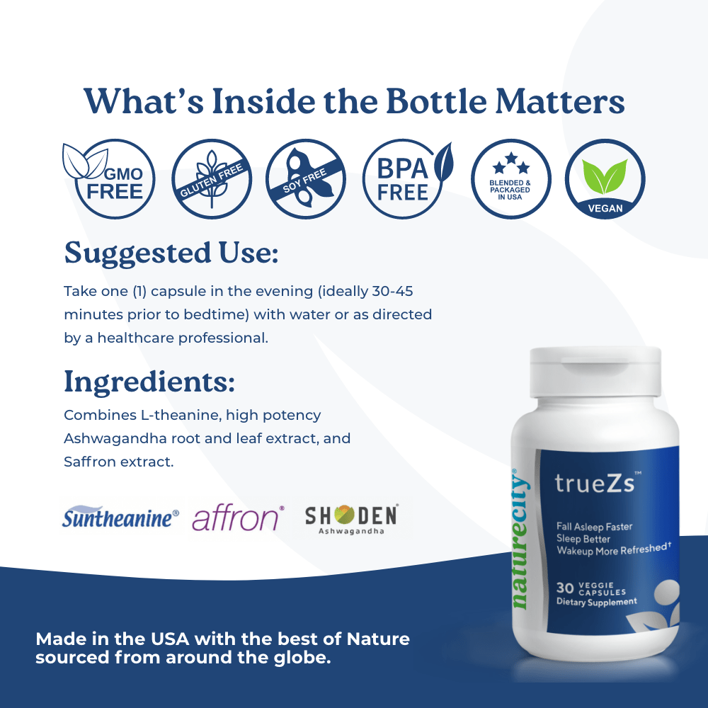 A key feature of the TrueZs formula is each of the 3 ingredients can help you improve restorative sleep as part of helping you sleep better at night. The calming effects of Suntheanine® help soothe your racing mind, promoting a deep regenerative sleep.